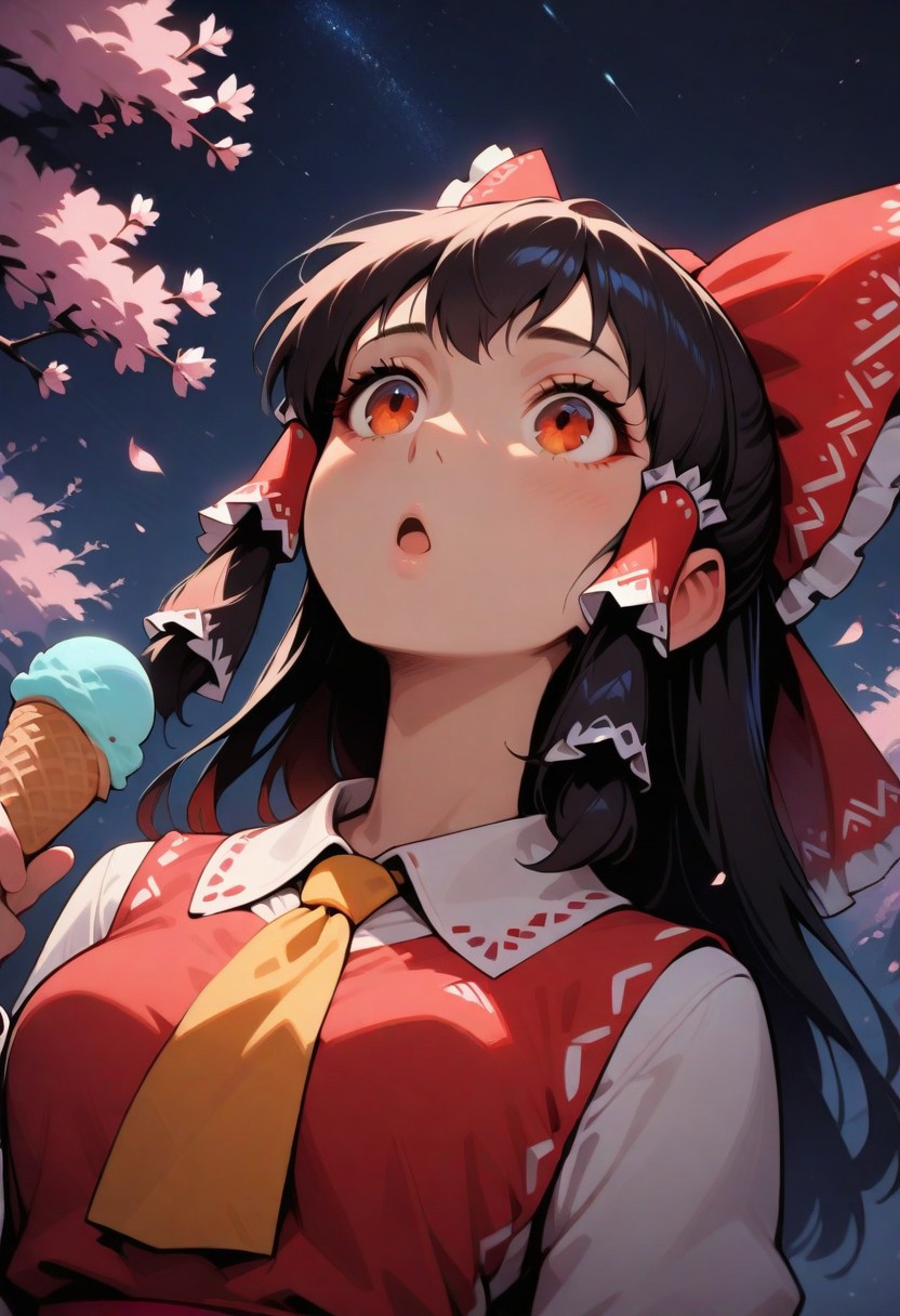 1girl, solo, hakurei_reimu, holding ice cream cone, ; looking up, starry sky, night sky, cherry blossom, upper body, masterpiece, best quality, very aesthetic, absurdres